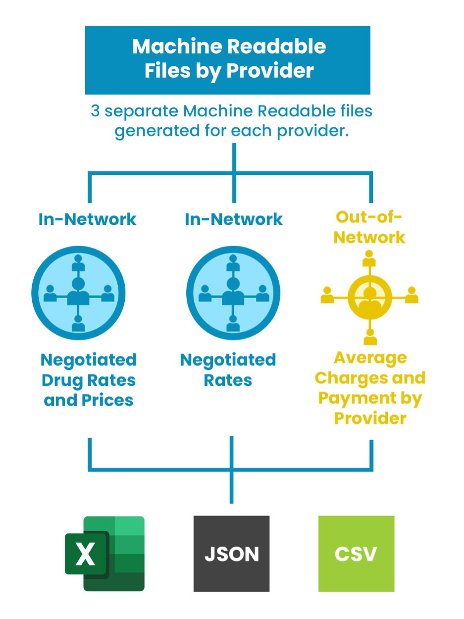 Providers will need to provide 3 separate machine-readable files (Excel, JSON, CSV) for the following: